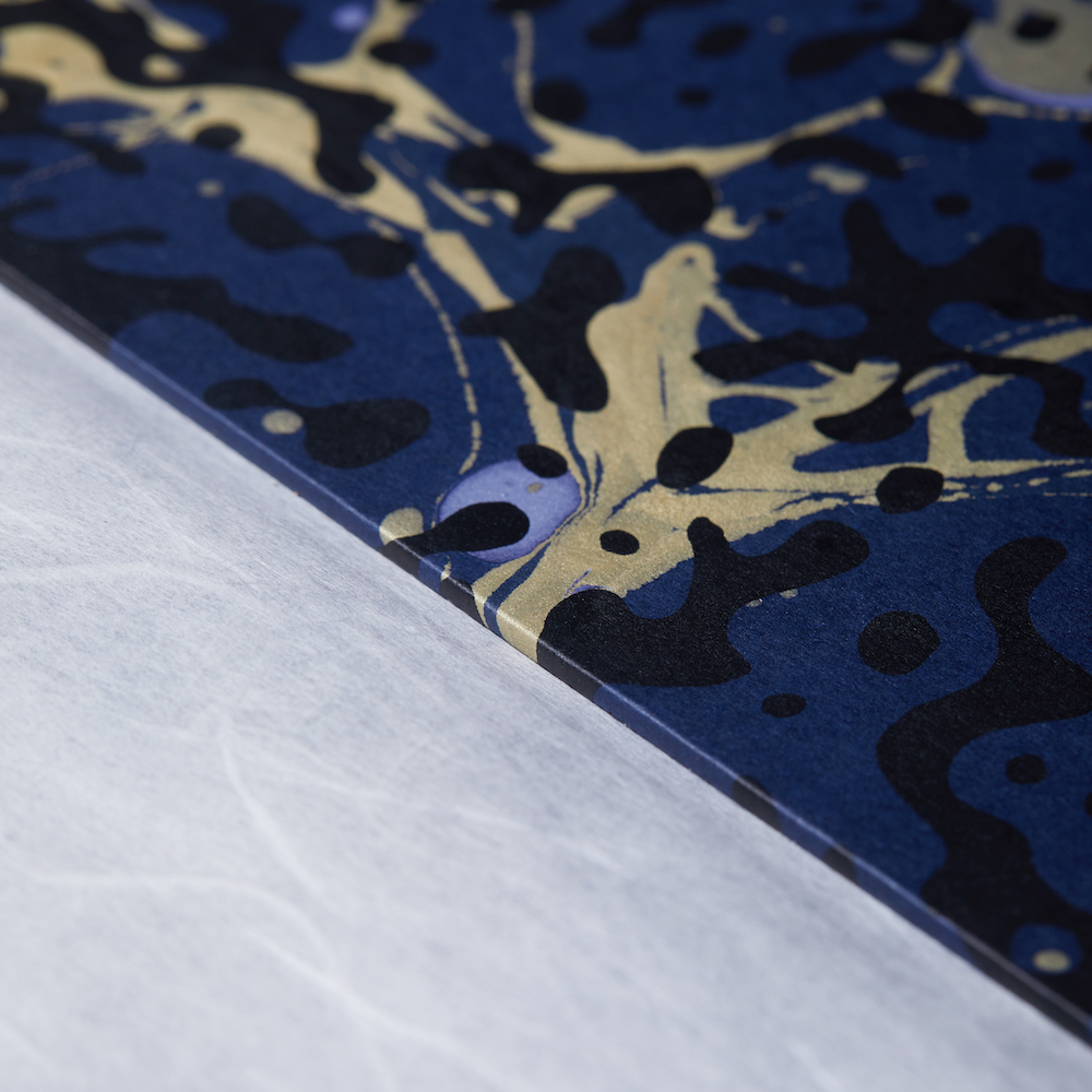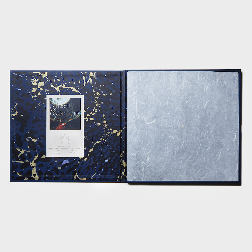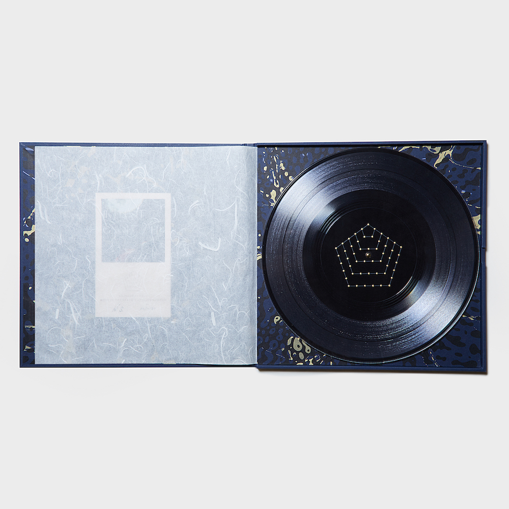 The interior is lined with hand-marbled end papers incorporating elements of the original artwork. The transparent vinyl record is hand finished, and protected by a heavy-weight hand stamped slip-matt underneath and a leaf of Japanese tissue paper protecting from dust on top. A single sheet of fine paper is included with track list and credit.