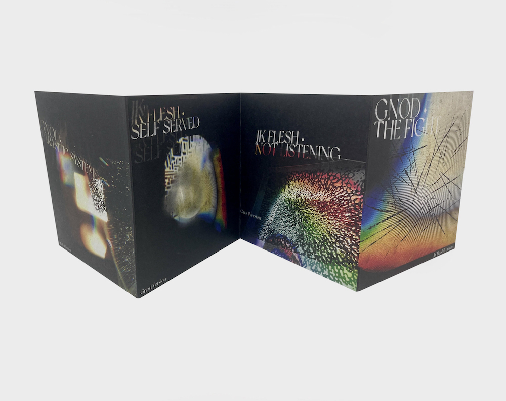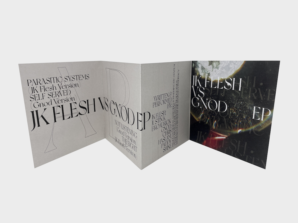 "Quite simply delicious collab 12” that’s been hand-cut! on a lathe! in very limited numbers! but might conceivably have been hewn from ice. Industrial rock pioneer Justin Broadrick, as JK Flesh, and the gnucleus of Gnod (Chris Haslam and Paddy Shine) bring out each other’s good side by giving the other party two tracks each to remix. The results have Birmingham techno welly, dub apocalyptica, jungle basslines, percussive workouts that aren’t much like what you’d expect from either party… a crucial crossover event and quite possibly a wee collectors’ item too." - greedmagTracklisting