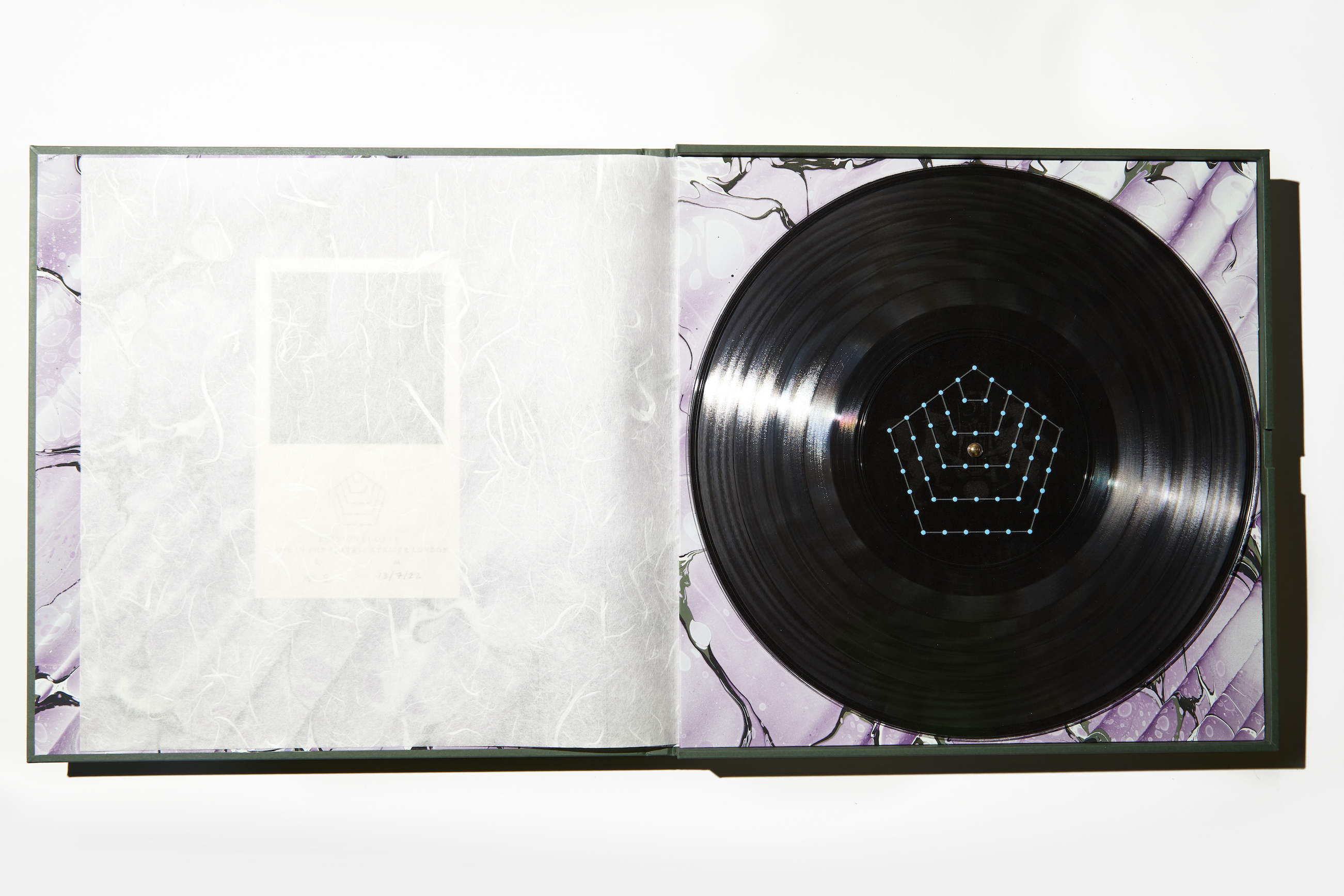 Editions 1-50 come in a hand made sleeve foil-stamped with the edition number and finished with book cloth taped edges and a letter-pressed plate featuring original artwork and maker information. The record is cut on transparent vinyl and engraved with the 51 editions logo. It is hand painted with the edition number.