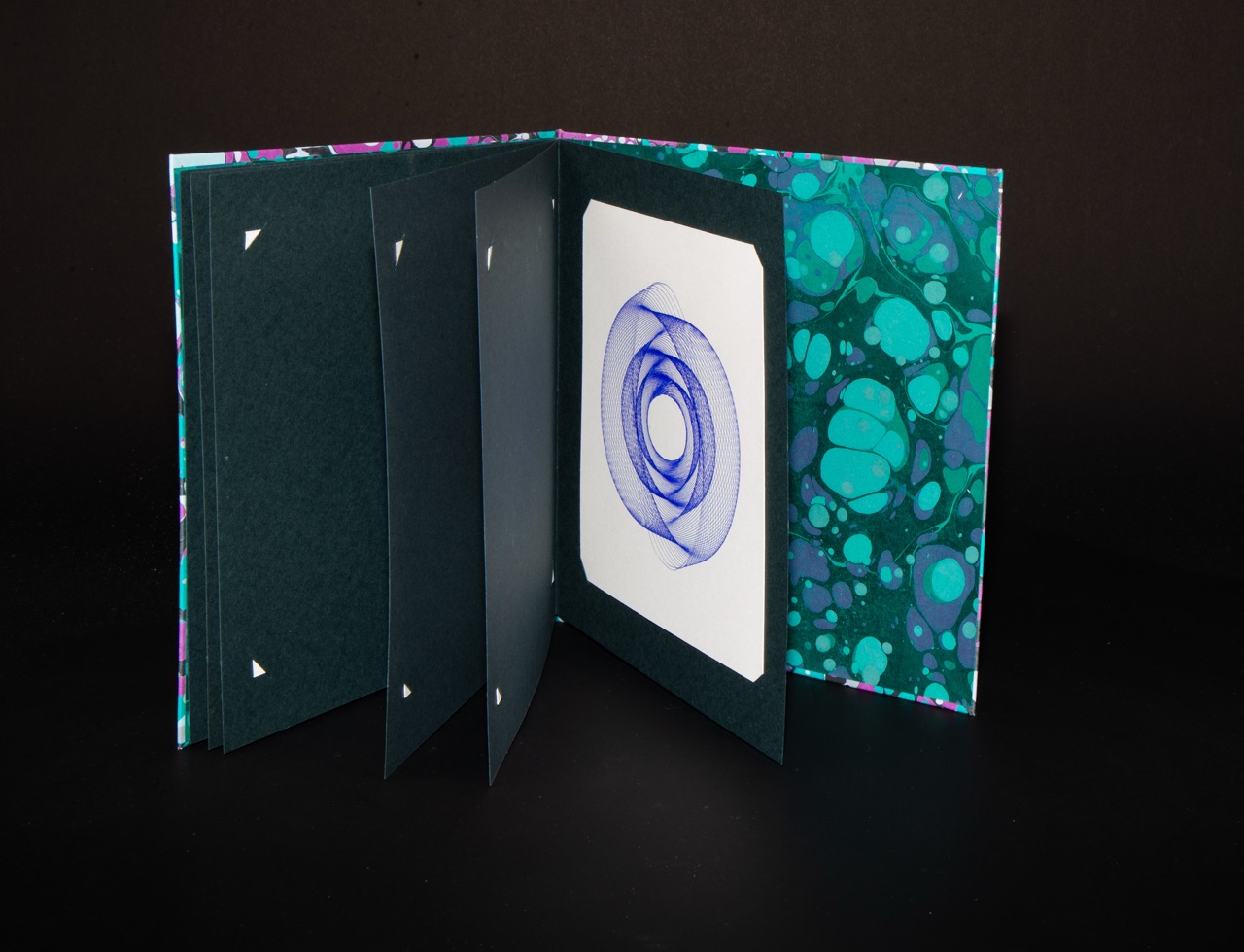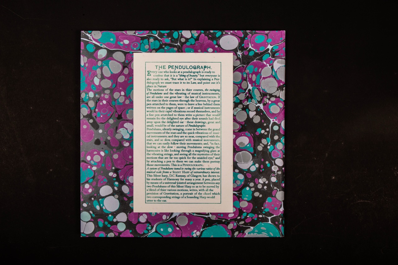 Also contained in the box is a hand-bound book containing 6 original pendulograph drawings. These were made with a pendulograph constructed specially for this purpose. The front and back of the book feature risographed facsimiles of plates from the original 1881 treatise, which help to give a deeper understanding of the theory behind these extraordinary drawings.