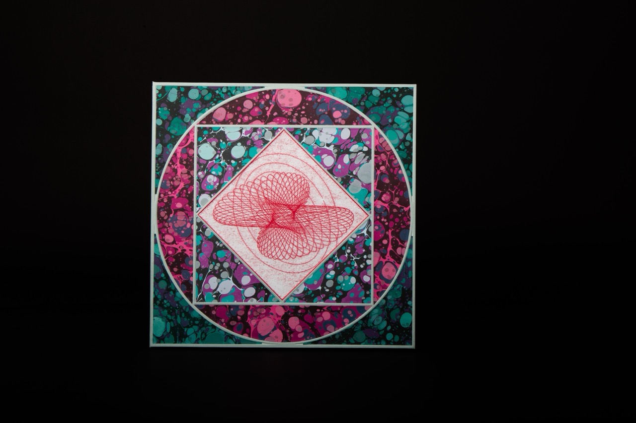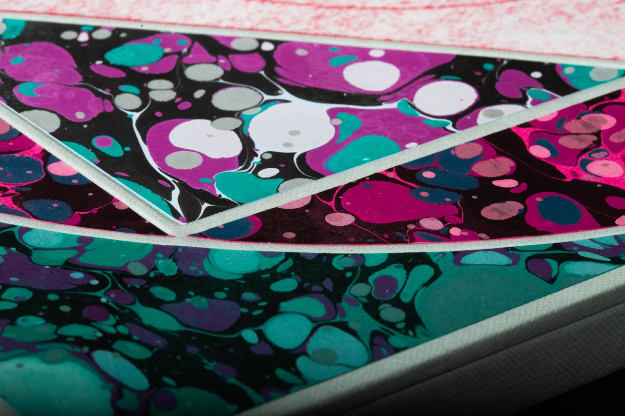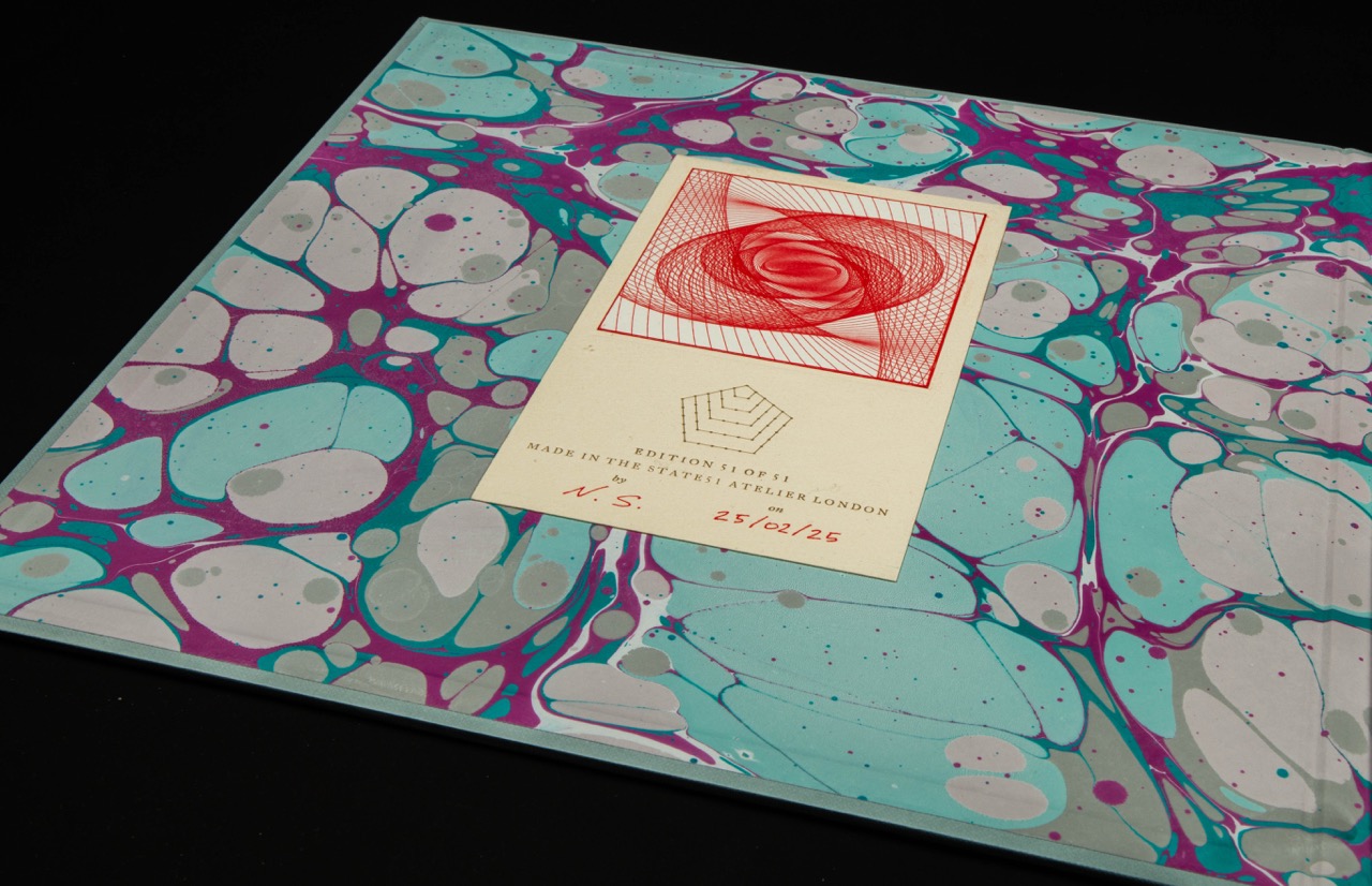 The box is made from tough composite panel with an invisible magnetic closure. It’s decorated with custom designed marbled paper, with a unique pendulograph mono print in the centre.