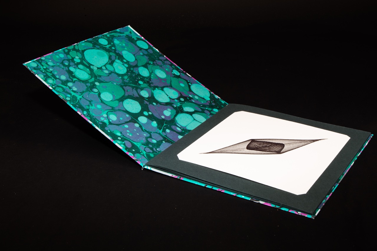 Marbled paper also adorns in the inside of the box, along with a letter-pressed bookplate, signed and dated to authenticate it as an atelier 51st edition.