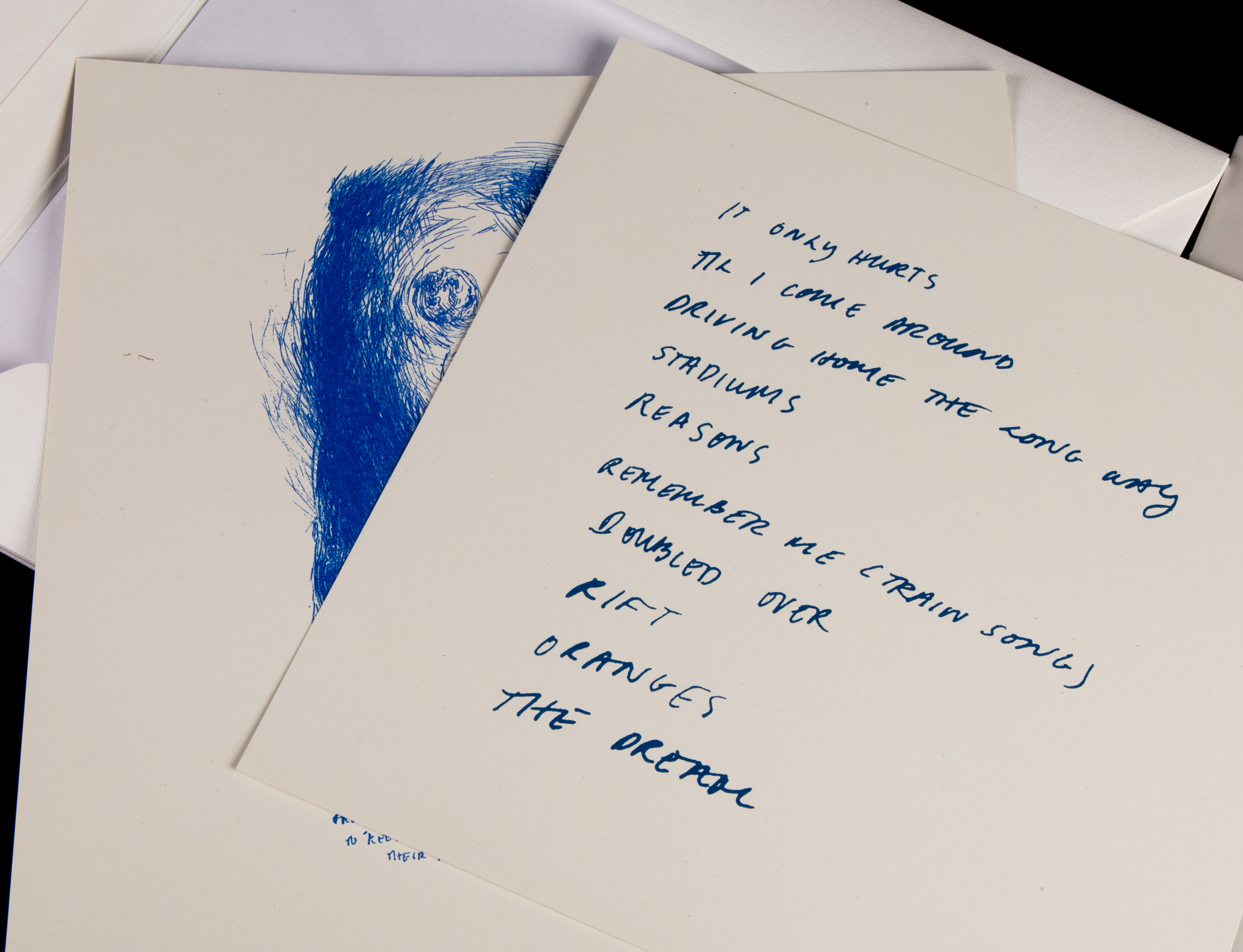 The outer case presents this drypoint plate, its etched lines still holding the ghost of ink. The box is wrapped in a screen-printed, subtle dot-gradient recalling the constellation of marks that settle on car windows, a quiet nod to Clara’s deep affection for her car. Opening this layer reveals the inner casing, printed with Clara’s handwritten tracklist drawing the listener even closer to her, echoing the intimacy of the album.