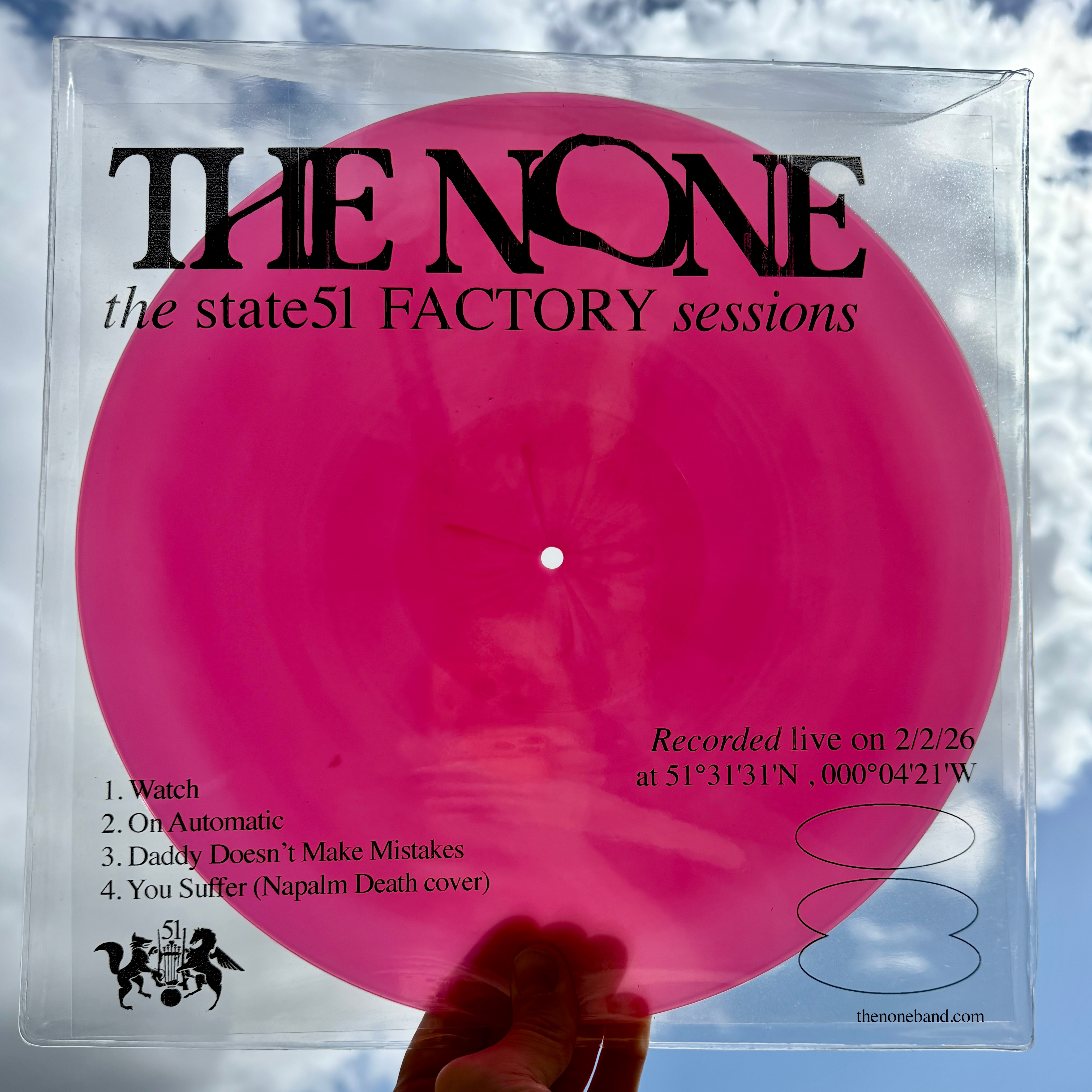 We’ve pressed a very special, very limited run of 51 records of THE NONE's live session. Cut to lathe in realtime, in-house at state51 by First Cut Vinyl, the 12” records are packaged with a printed acetate inner in a clear plastic sleeve. Each copy is hand-numbered, signed by the band, and assembled in the state51 Atelier. Vinyl colour variants across the pressing include purple, yellow, pink, red: order for a surprise.